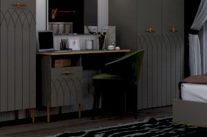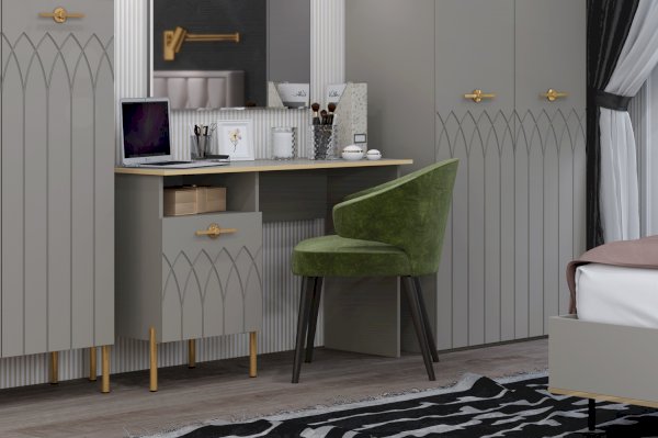 • Надежные материалы – ЛДСП класса эмиссии Е 1 в сочетании с МДФ фасадами. Поверхность фасадов soft touch с фигурной фрезеровкой – один из самых модных трендов в дизайне мебели. Яркие ручки и золотая кромка эффектно подчеркивают стиль мебели.