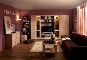 Широкий выбор модулей коллекции SHERLOCK помогает создать уютную гостиную с комфортным рабочим местом, что очень важно для маленькой квартиры. Вместительный 15 Стол письменный можно расположить между шкафами и навесить над ним 4 Шкаф навесной на любой удобной для Вас высоте. 5 Тумба МЦН – отличный вариант не только для хранения вещей, но и для размещения на ней телевизора. Шариковые направляющие тумбы обеспечивают плавность хода выдвижных ящиков. Большой выбор шкафов коллекции SHERLOCK дополнит и то, что 10 Шкаф угловой можно выбрать либо с фасадом Стандарт, либо с фасадом Зеркало. Все фасады модулей коллекции декорированы классическим переплетом из МДФ.