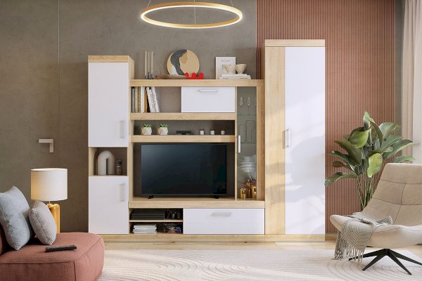 Состоит из: место под телевизор, витрина со стеклом, 4 шкафа с дверцами, открытые полки для аксессуаров, ниши под аудио-, видеотехнику.
