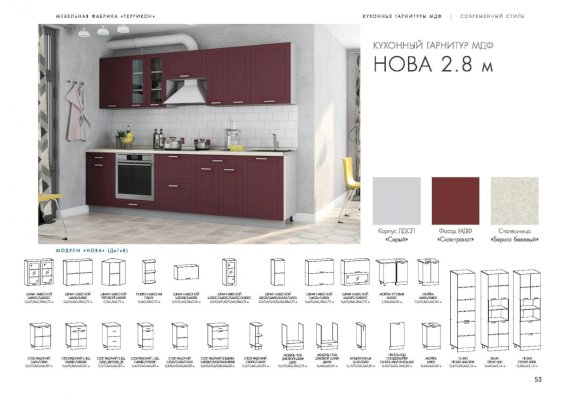Кухня Нова изговаливается также в цветах серый/силк топаз; серый/силк тирамису; серый/силк алмонд; серый/силк гранат. Модули в этих цветовых решениях вы сможете найти в нашем интернет-магазине.