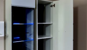 Белые глянцевые фасады МДФ и витрина с прозрачным стеклом сделают Вашу гостиную светлее и уютнее. Задняя стенка комода Йорк черного цвета красиво контрастирует с фасадами и корпусом белого цвета. Светодиодная подсветка сделает акцент на дорогих для Вас вещах, таких как фото, статуэтки, посуда или книги. На комод можно поставить вазу с цветами или украсить Вашу гостиную другими милыми вещами, а вместительные полки порадуют Вас своими размерами. Комод выполнен из экологически безопасных материалов.