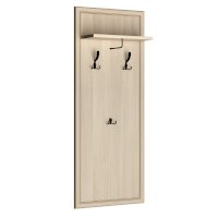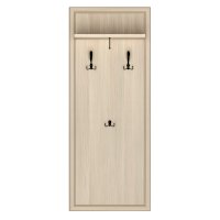 Конструкция вешалки включает 2 ряда крючков: верхние трехрожковые и нижний двухрожковый крючки. Удобная полочка создана для головных уборов и аксессуаров, а под ней закреплена небольшая штанга для одежды на вешалках.