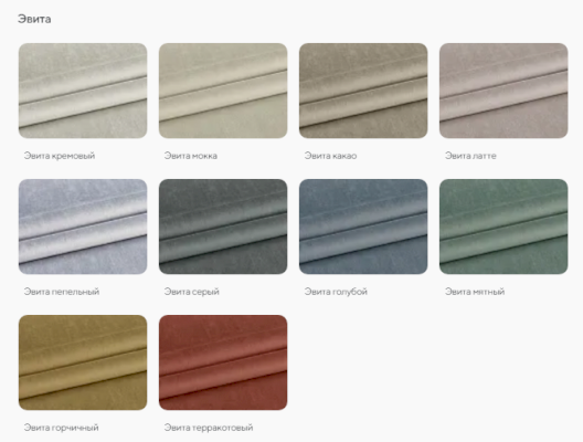 | Цвет | БЕЖЕВЫЙ / БЕЛЫЙ / ГОЛУБОЙ / ЖЕЛТЫЙ / ЗЕЛЕНЫЙ / КОРИЧНЕВЫЙ / ОРАНЖЕВЫЙ / РОЗОВЫЙ / СЕРЫЙ / СИНИЙ / СИРЕНЕВЫЙ / КОФЕ |