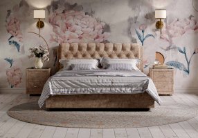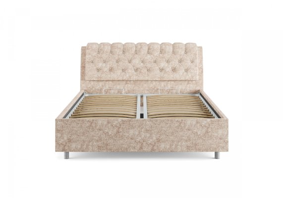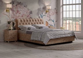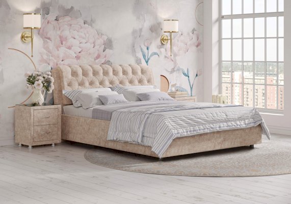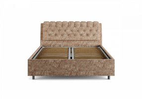 Элегантная интерьерная кровать с изголовьем, украшенным декоративными пуговицами и глубокой пиковкой. Модель изготовлена из ДСП. В комплект кровати входит кроватное основание. Каркас основания выполнен из металла, ламели - из берёзы. При необходимости в комплект можно включить подъемный механизм с бельевым ящиком. Обратная сторона изголовья обита темно-серым спандбондом, но, при желании, её можно выполнить из основного обивочного материала.