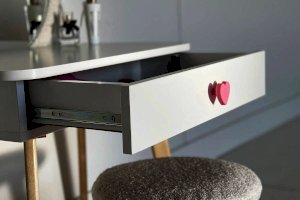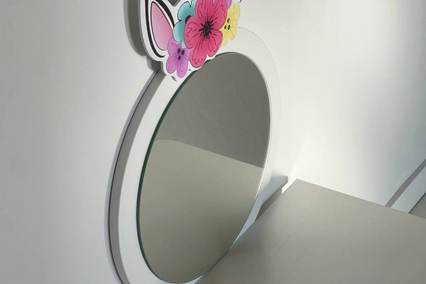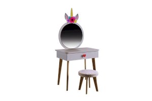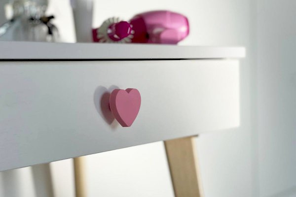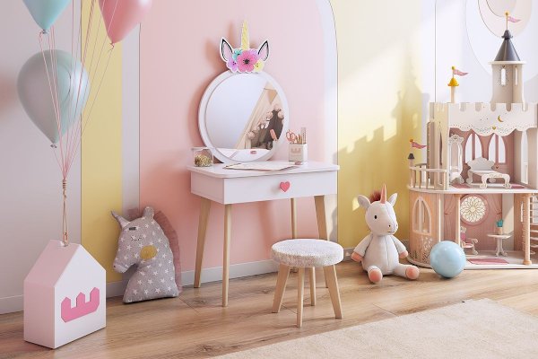 Комплект многофункционален: девочка может наводить красоту, смотрясь в круглое зеркало, декоративный элемент "Единорожку" можно использовать как крючки для украшений, на столешнице разложить все нужные и важные вещи для марафета или лепить из пластилина и рисовать. В выдвижной ящик на шариковых направляющих складывать необходимые вещи. Тактильно приятная на ощупь ручка в форме сердечка, никого не оставит равнодушным, к ней захочется прикасаться все снова и снова.