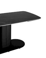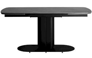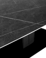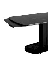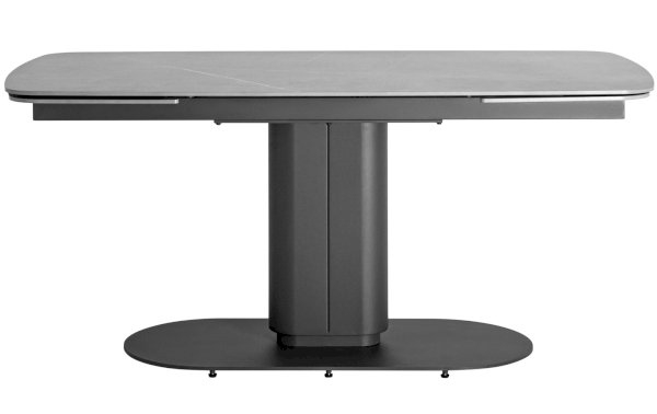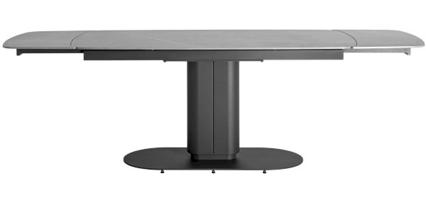 Столешница сделана из керамики - устойчивый, прочный и экологический материал. Закруглённые углы и матовая поверхность придают лёгкость и лаконичный образ. По бокам стола расположены дополнительные раздвижные элементы, которые увеличивают полезную площадь столешницы на 40 или 80 см в длину. Монолитная ножка имеет обтекающие формы и закруглённые углы, повторяя мотив всей конструкции. Основание оснащено защитными заглушками, которые не позволяют металлическим частям соприкасаться с полом и портить покрытие при перемещении.