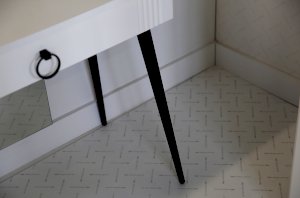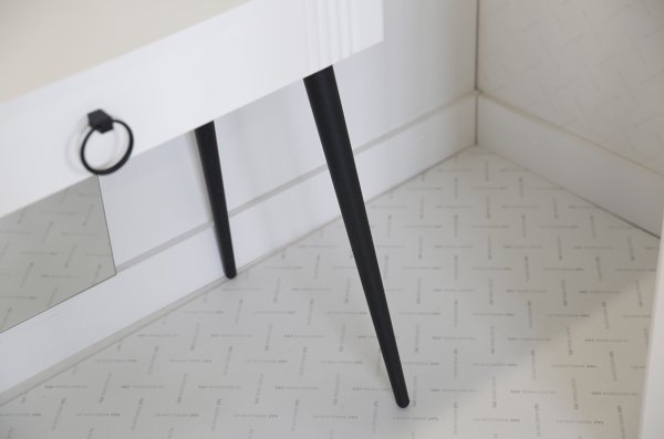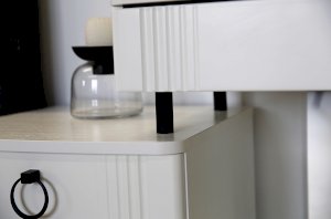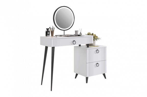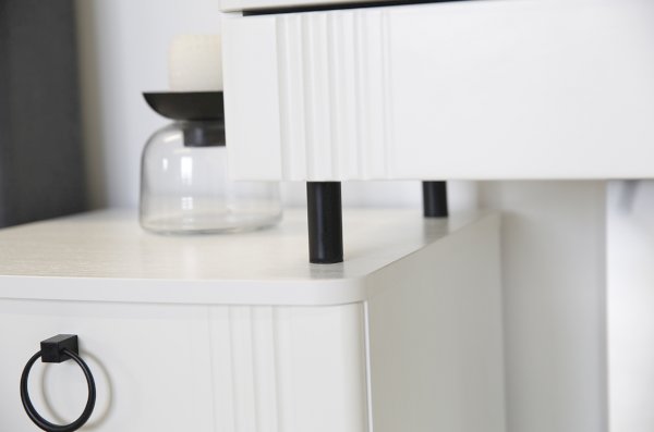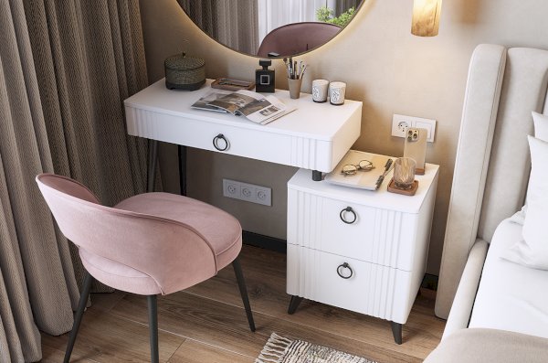 Туалетный столик  "Ева" прекрасно впишется в интерьер спальни или ванной комнаты благодаря своему стильному дизайну и функциональности. Вместительные выкатные ящики обеспечат удобное хранение косметики, украшений и других мелочей. Шариковые направляющие гарантируют легкость открывания и закрывания ящиков, а металлические ручки добавляют стильный акцент. Высокие черные опоры придают столику устойчивость и элегантность. Цветовое сочетание белого корпуса из ЛДСП и фасада из МДФ облицованного пленкой ПВХ создает свежий и модный образ мебели. Необычная фрезеровка фасада добавляет изысканности и утонченности этому туалетному столику.