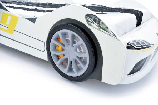 Каркас кровати выполнен из экологичного ЛДСП класса эмиссии Е1, соответствует всем стандартам качества. Кровать оборудована объемным бампером из ABS-пластика, к нему прилагаются наклейки в виде фар, радиаторной решётки и логотипа автомобиля. Все края кровати покрыты кромкой ПВХ 1 мм и безопасны для малышей.